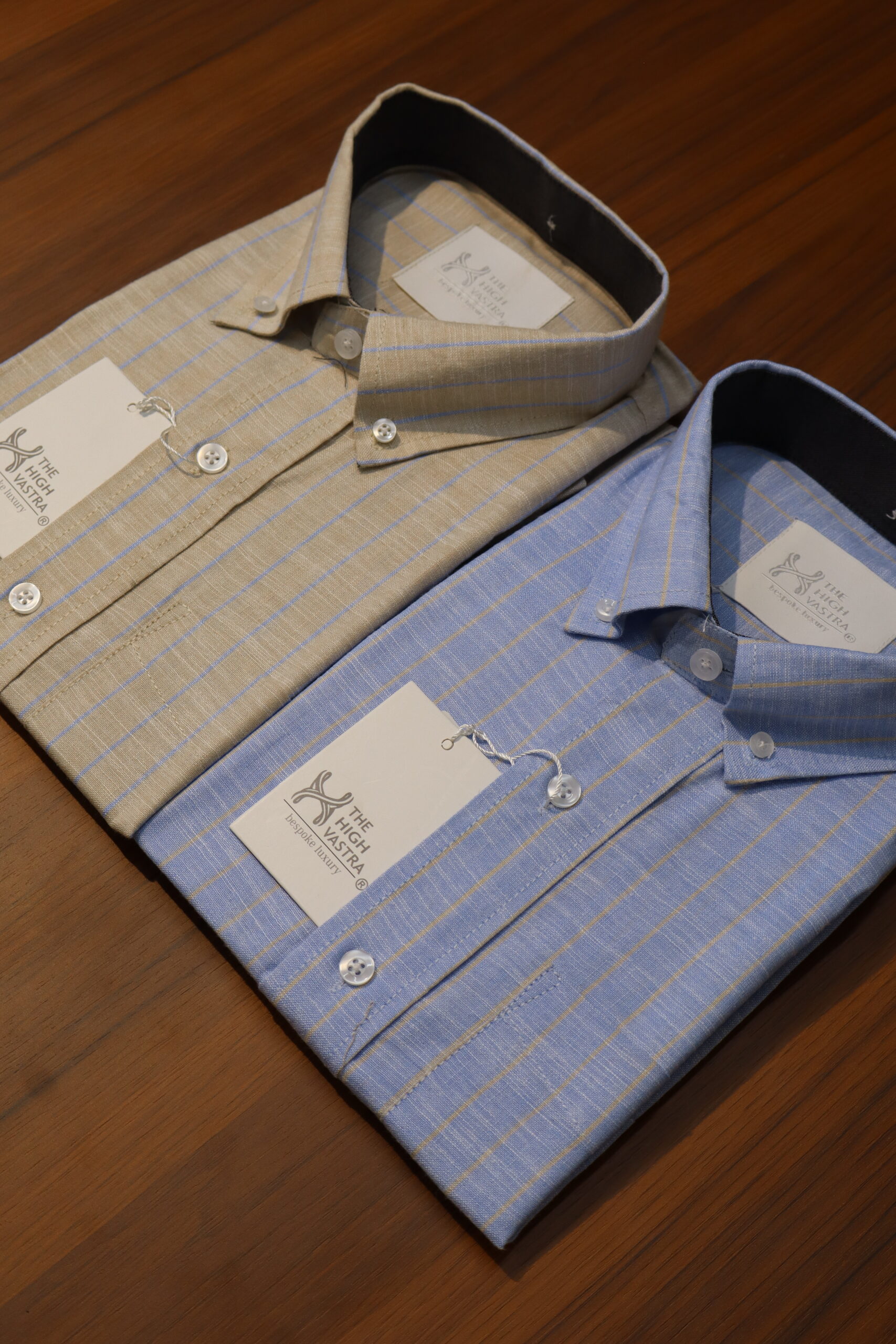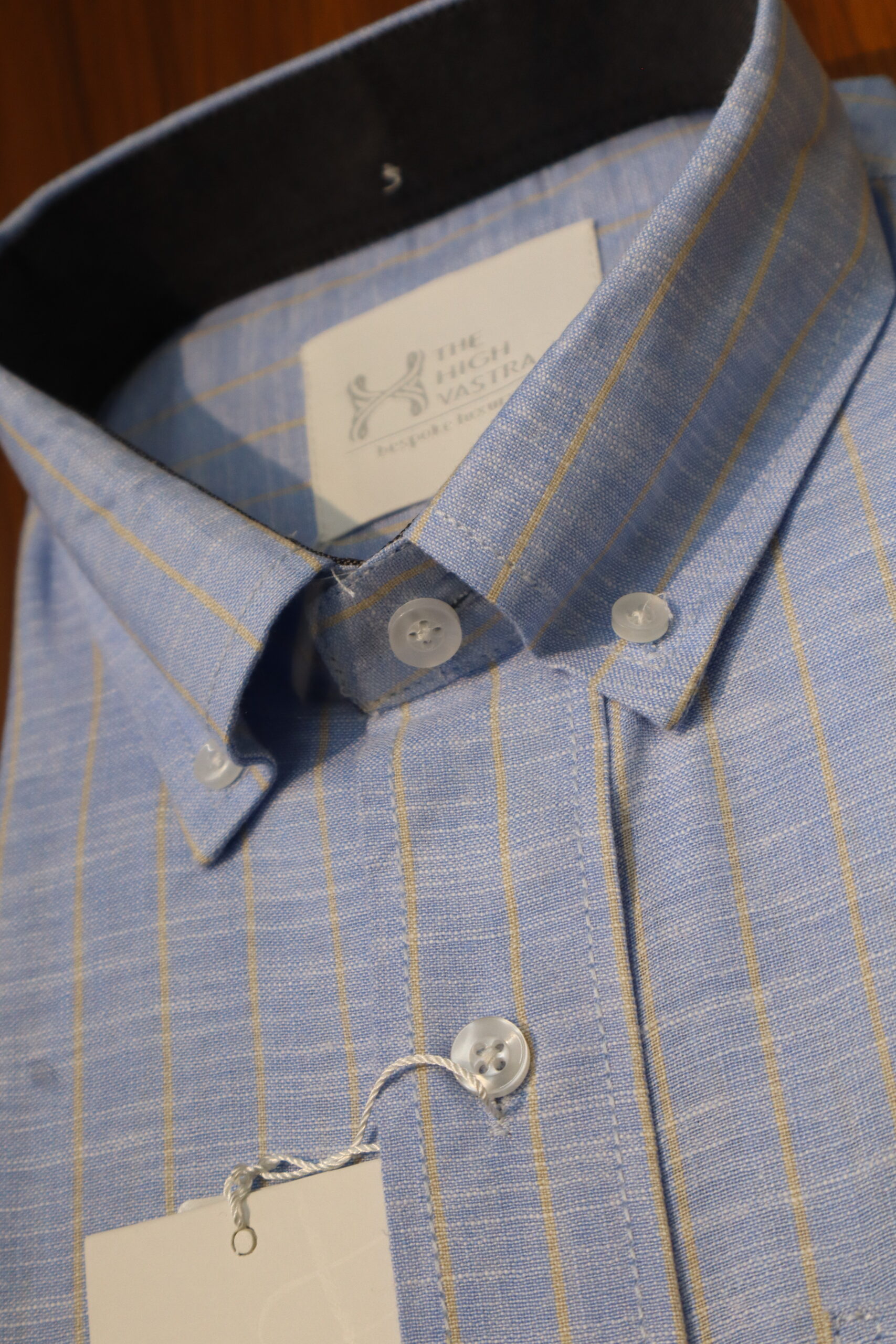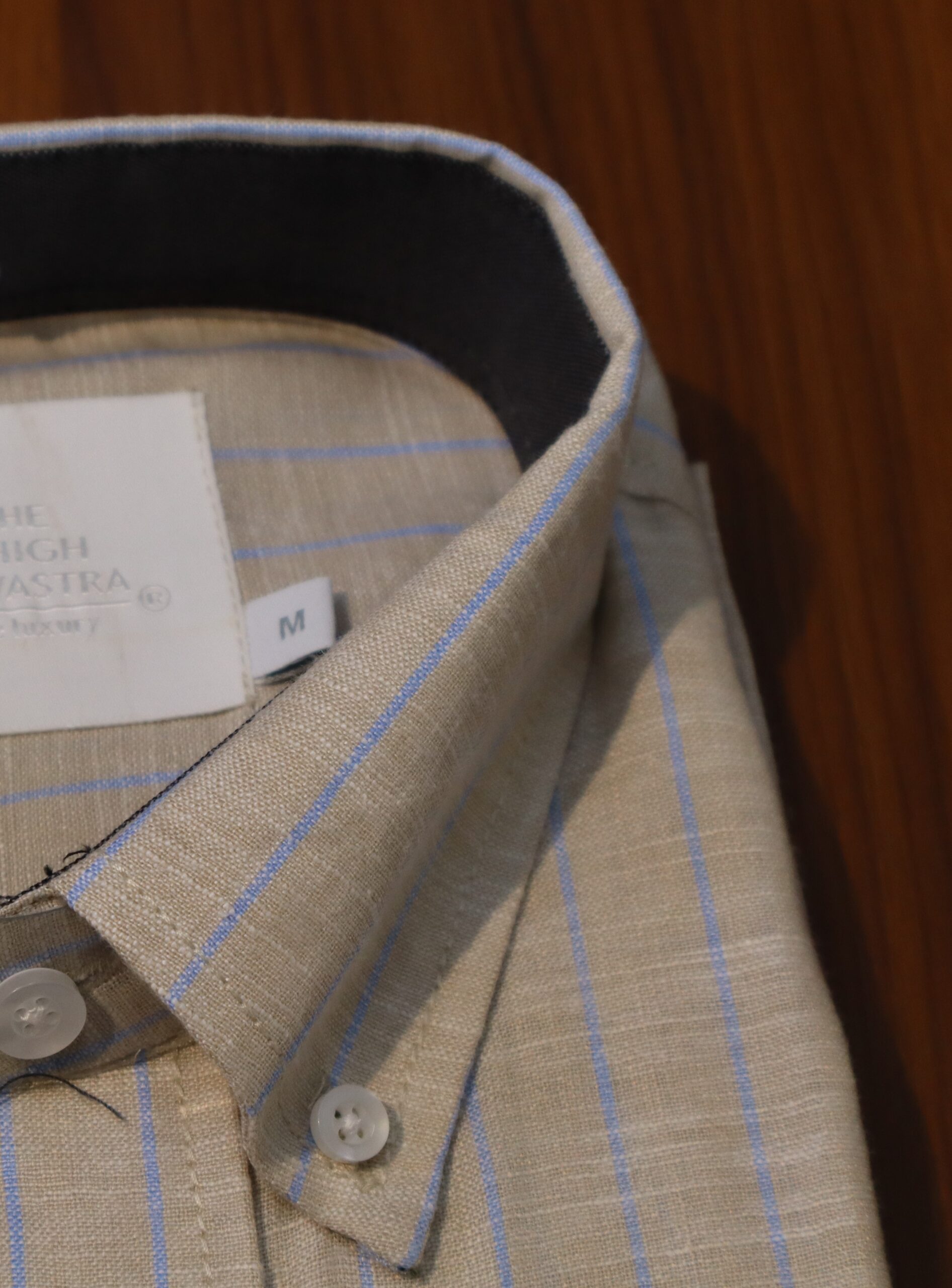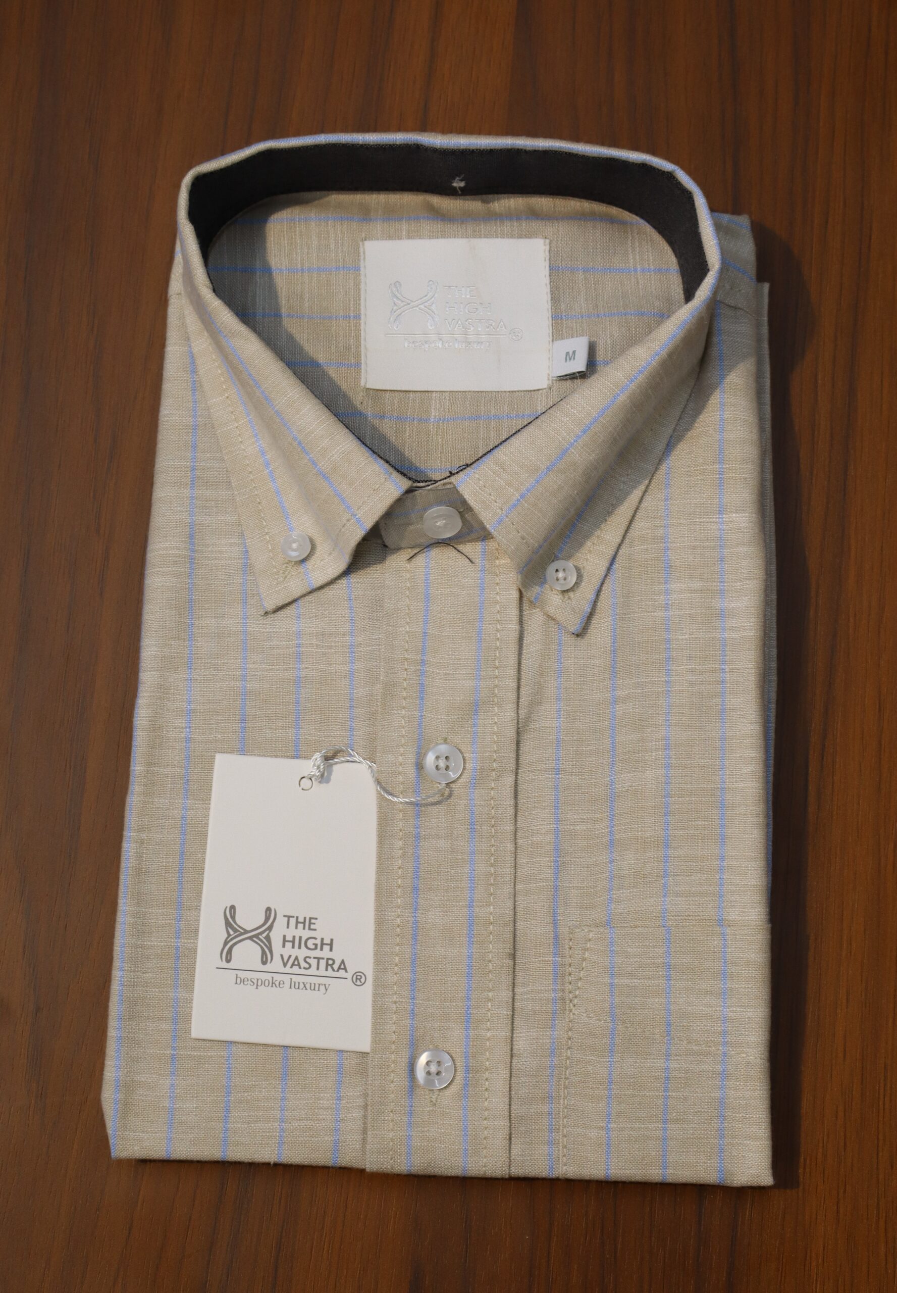 The High Vastra shirt in this image is another example of a premium, imported fabric shirt, this time featuring a sophisticated beige base with subtle blue linear patterns.Here is a long description tailored for this specific shirt for your website:Product Title IdeaThe High Vastra Premium Beige & Blue Striped Cotton Linen Blend Shirt – Imported FabricLong DescriptionIntroducing a masterpiece of comfort and style from The High Vastra‘s exclusive imported collection. This shirt in a subtle beige tone with elegant blue stripes is a perfect blend of modern aesthetics and classic comfort.Key Features